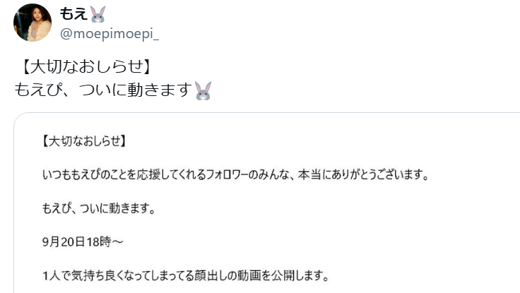 人気記事Popular Post 実は、、あの投稿には続きがありました 初体験の話をします… パジャマ姿での撮影について🐰 アンチコメントについて、正直な気持ち 最近の小さな楽しみについて🐰 9月20日18時~ ”すべて”を出します… 【特別なご案内】過去動画、再公開します🐰 新着記事New Post 【特別なご案内】過去動画、再公開します🐰 2025.09.29 もえの本音 9月20日18時~ ”すべて”を出します… 2025.09.19 もえの本音 パジャマ姿での撮影について🐰 2025.09.07 もえの本音 もえの本音 Profileこの春から大学2年生になりました🐰内気な性格を変えたくてSNSを始めました。もえぴって呼んでくれたら嬉しくなっちゃいます🐰