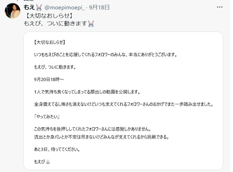 🐰もえちゃん、めっちゃ心のこもったメッセージありがとう😊 ファンのみんなからの温かい応援が、こんなにももえちゃんの心を動かしてるんだね、読んでてこっちまでじーんときちゃったよ、ほんと、ファンクラブ始めてから、もえちゃんの、もっとみんなに楽しんでもらいたいって気持ちがどんどん大きくなってるの、めっちゃ伝わるよ、新しい挑戦、めっちゃ勇気いるよね🥺でも、ファンがこれが見たいって言ってくれてた動画を出すって決めたその気持ち、ほんとすごいと思う✨